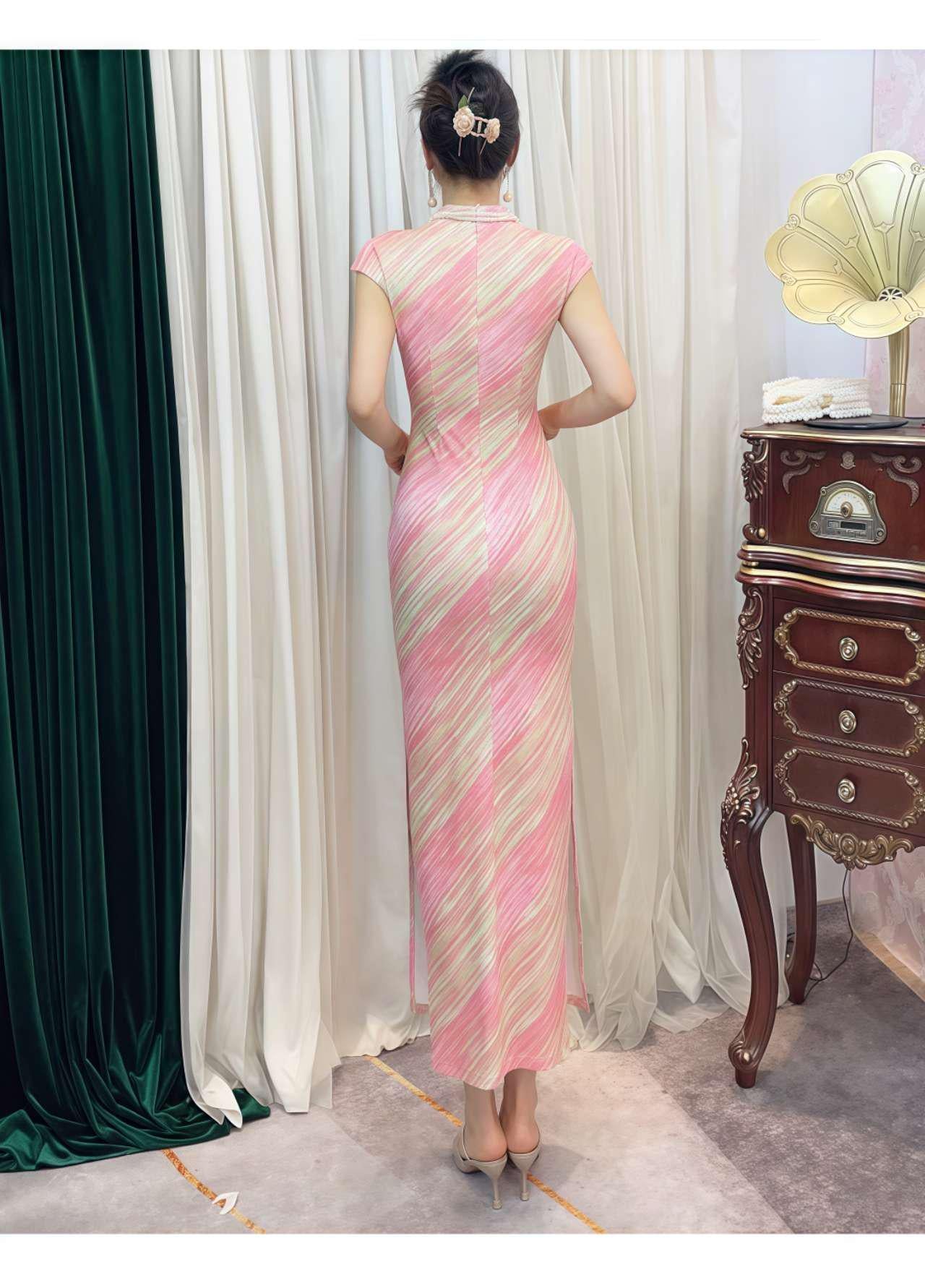 💗 Let yourself be enveloped in timeless femininity with this pink striped qipao, a charming blend of retro style and modern comfort. The soft diagonal stripes and stretchy fabric flatter your silhouette.