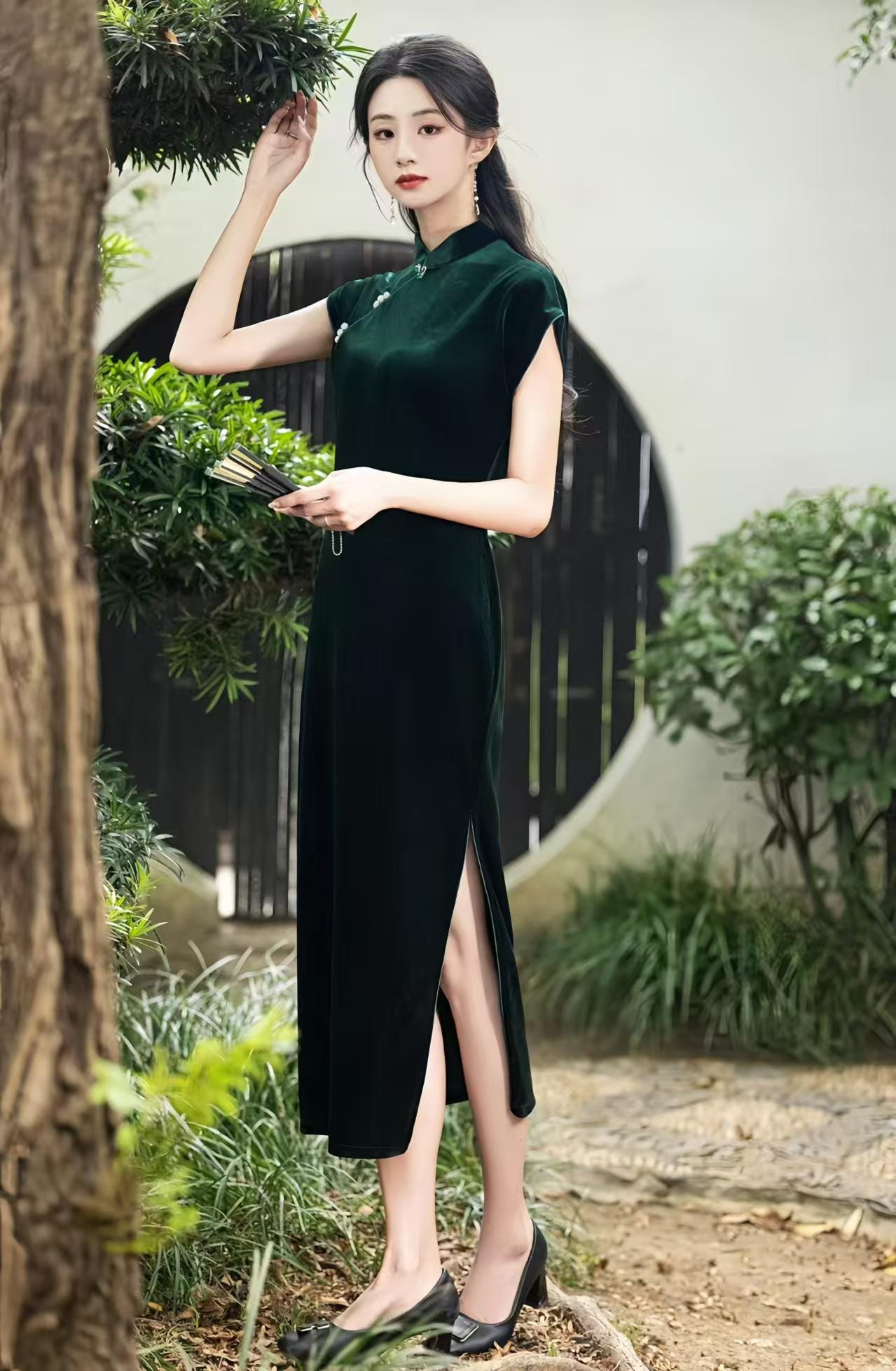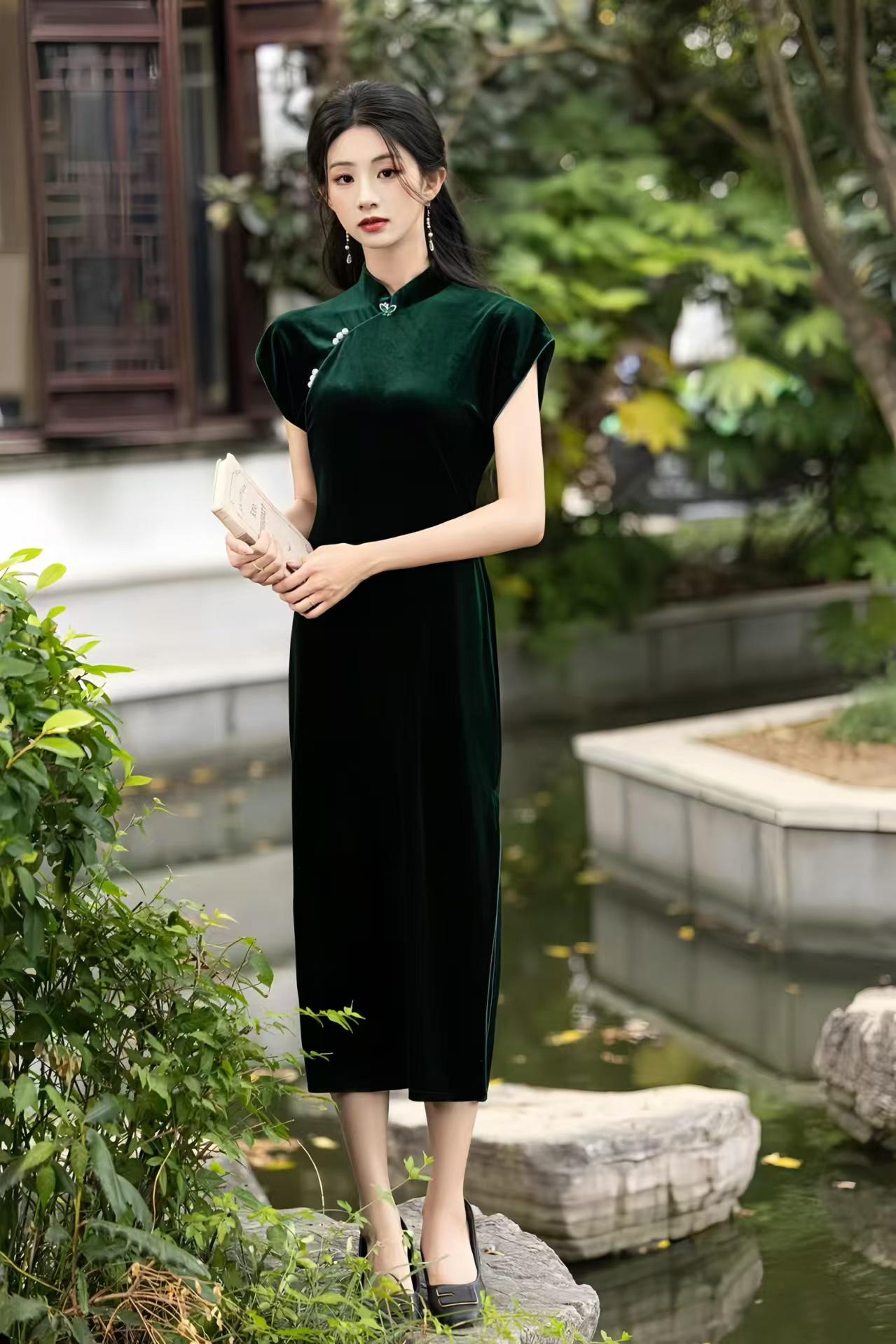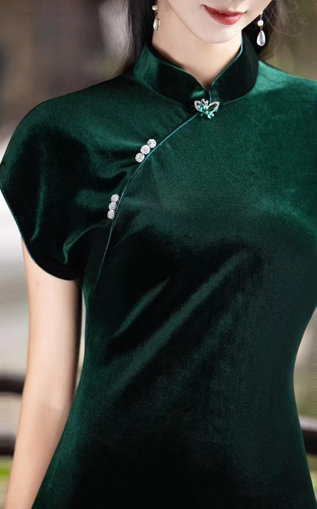 Green Velvet Qipao Dress, Elegant Midi Cheongsam Dress, Luxurious Oriental, Minimalist Chinese Style, Autumn Winter Party Set