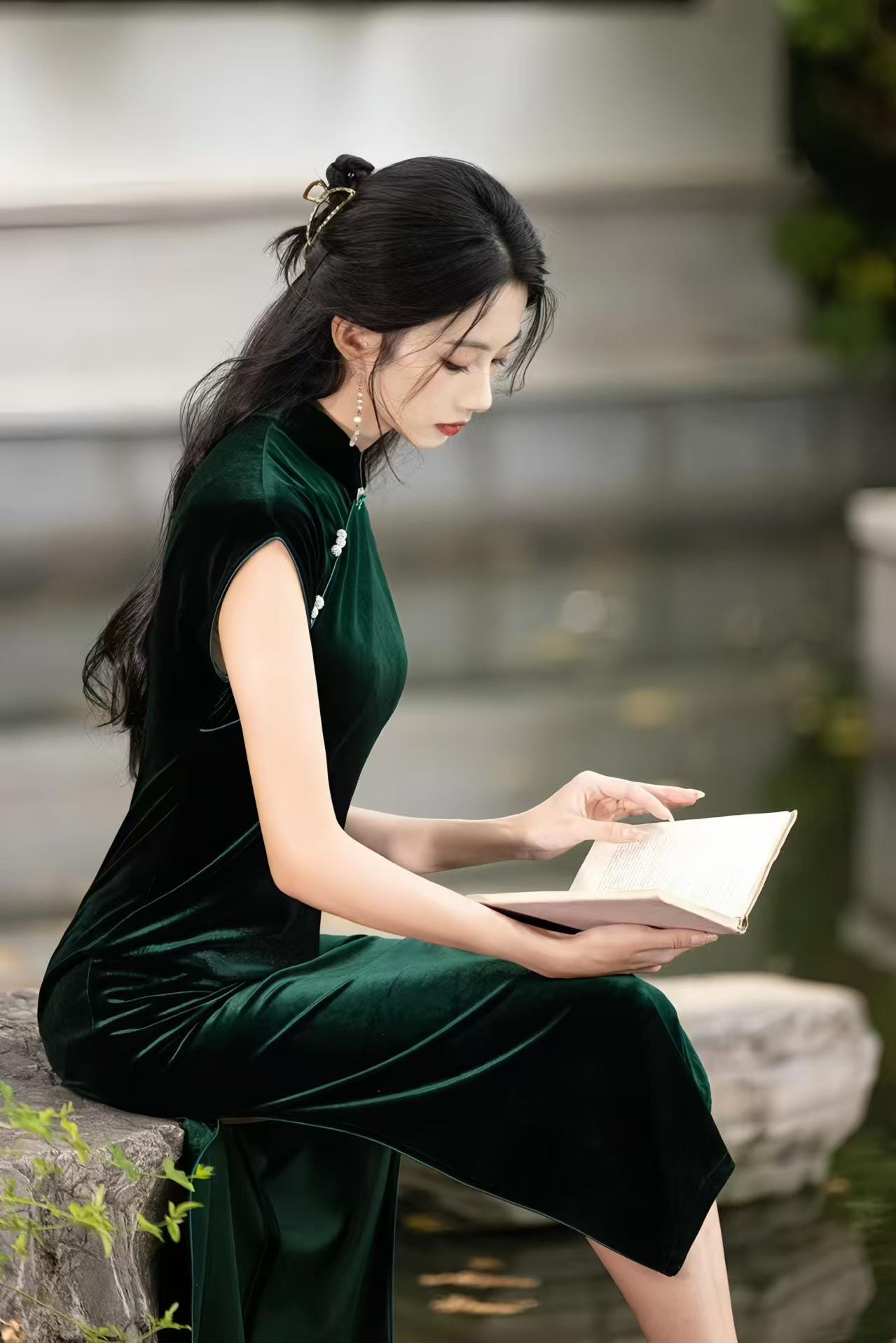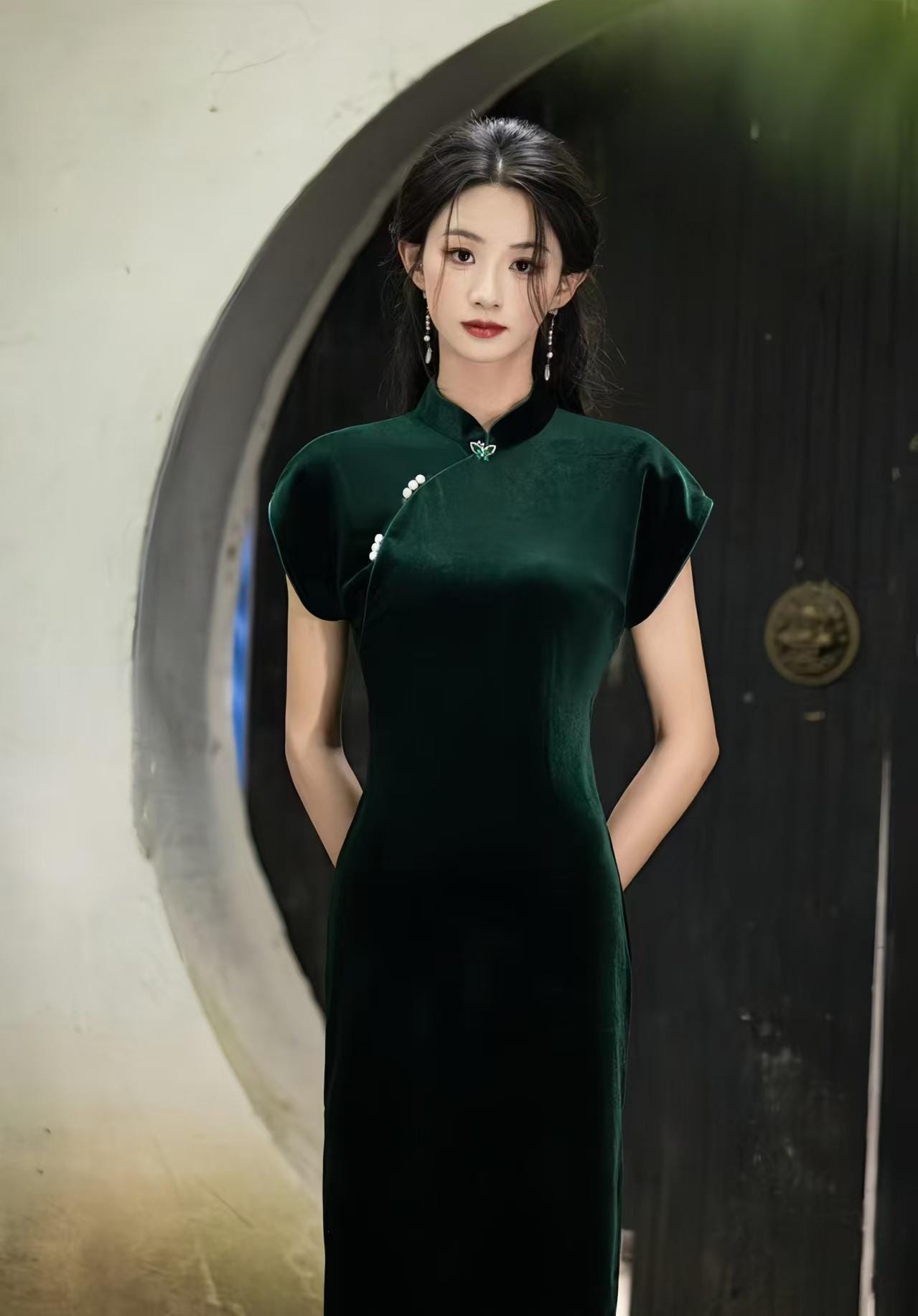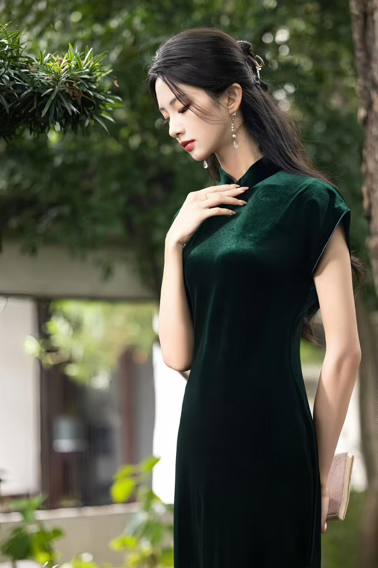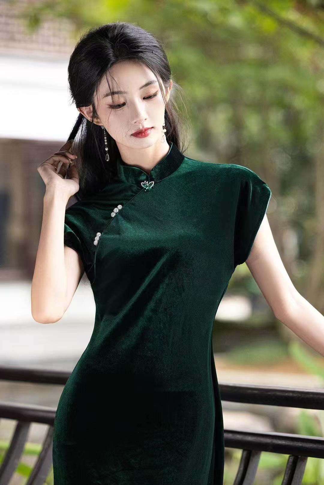 Green Velvet Qipao Dress, Elegant Midi Cheongsam Dress, Luxurious Oriental, Minimalist Chinese Style, Autumn Winter Party Set