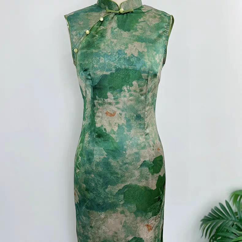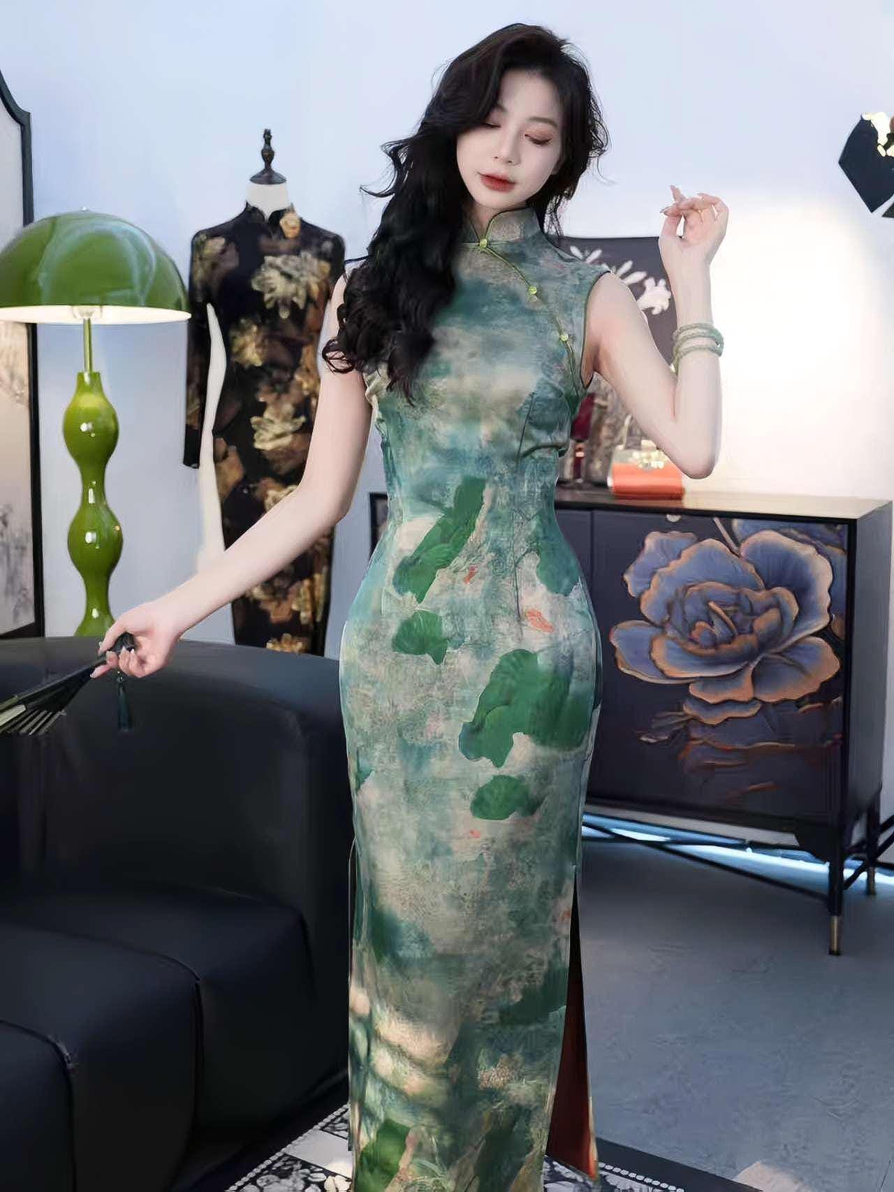 Nature-Inspired Green Qipao Dress, Elegant Asian Cheongsam for Women, Serene Summer Cheongsam, Lotus Print