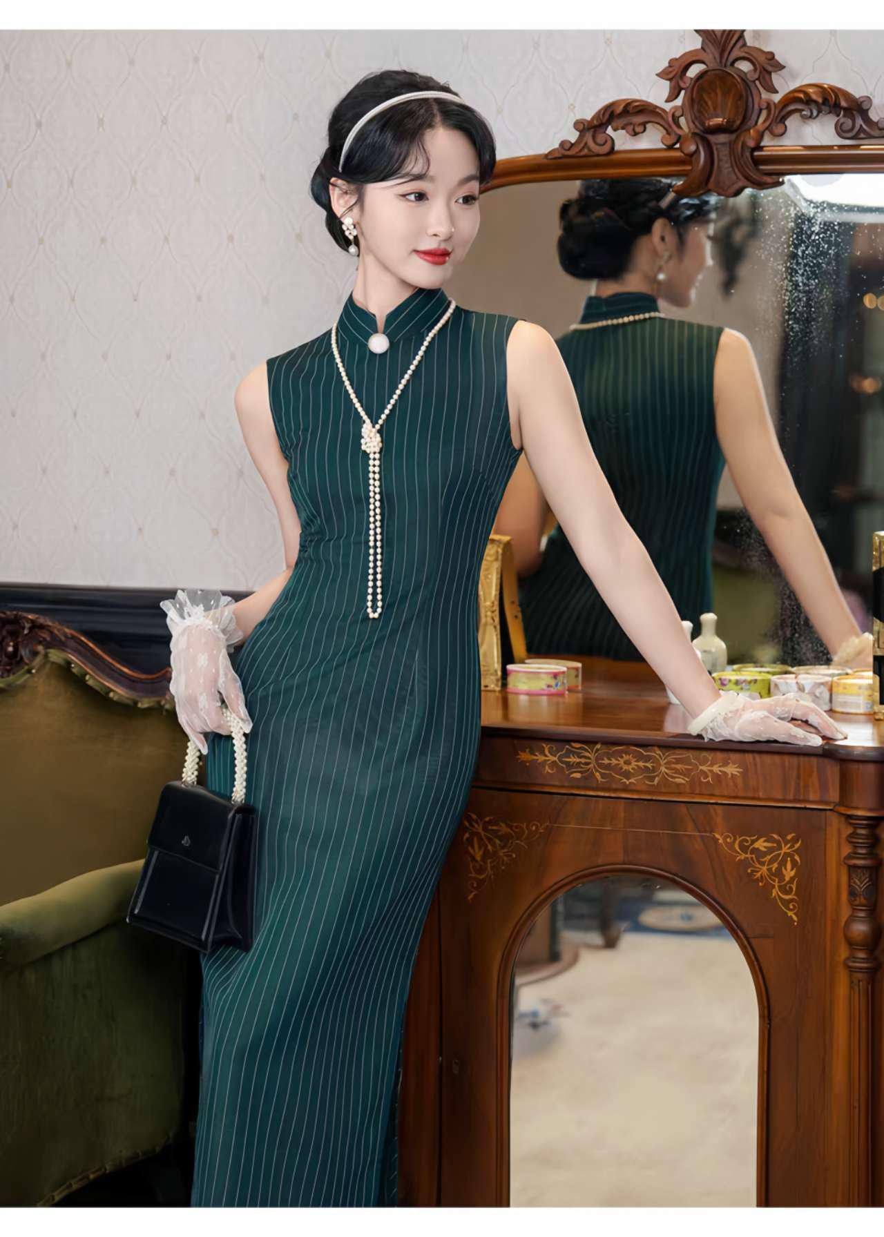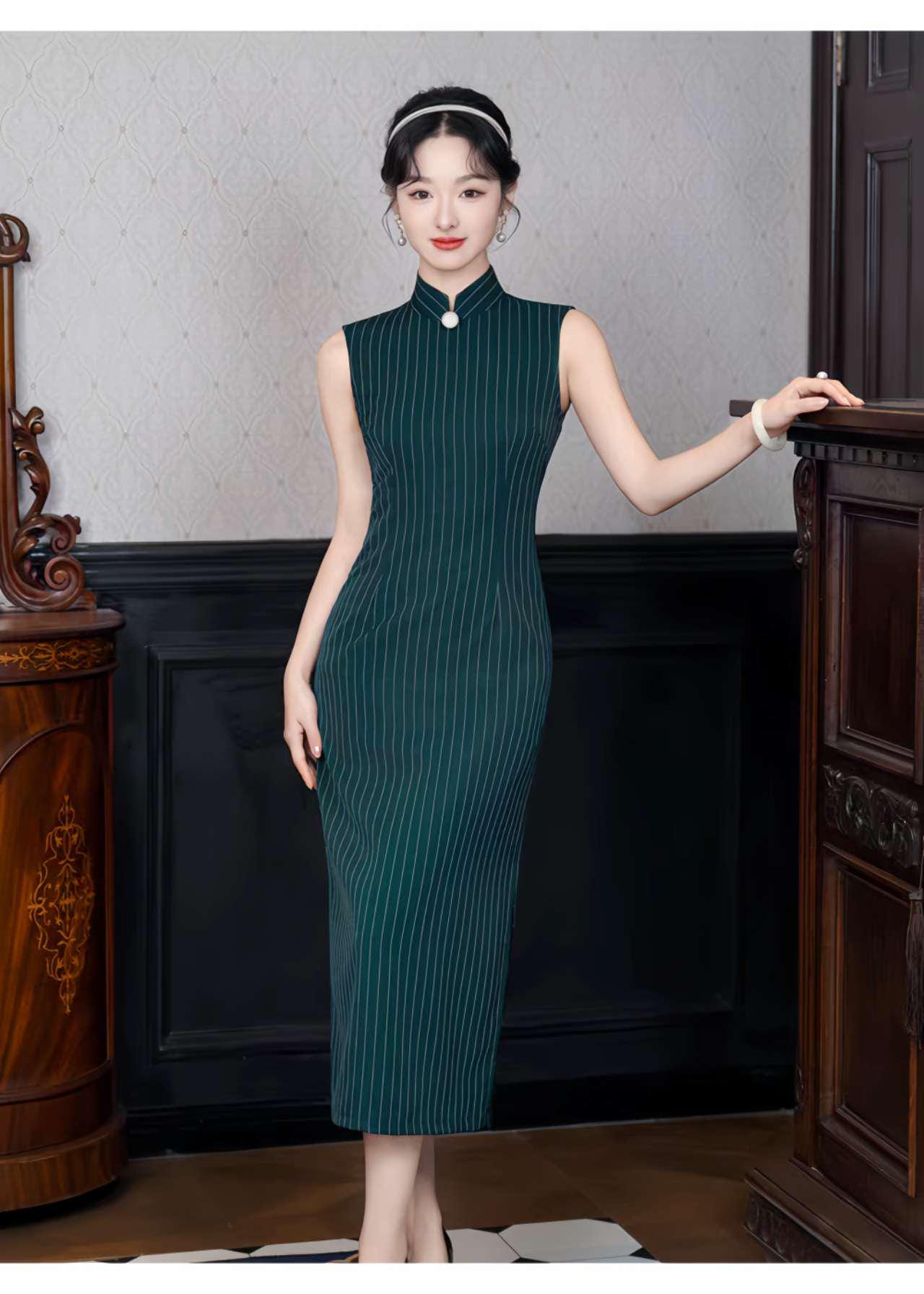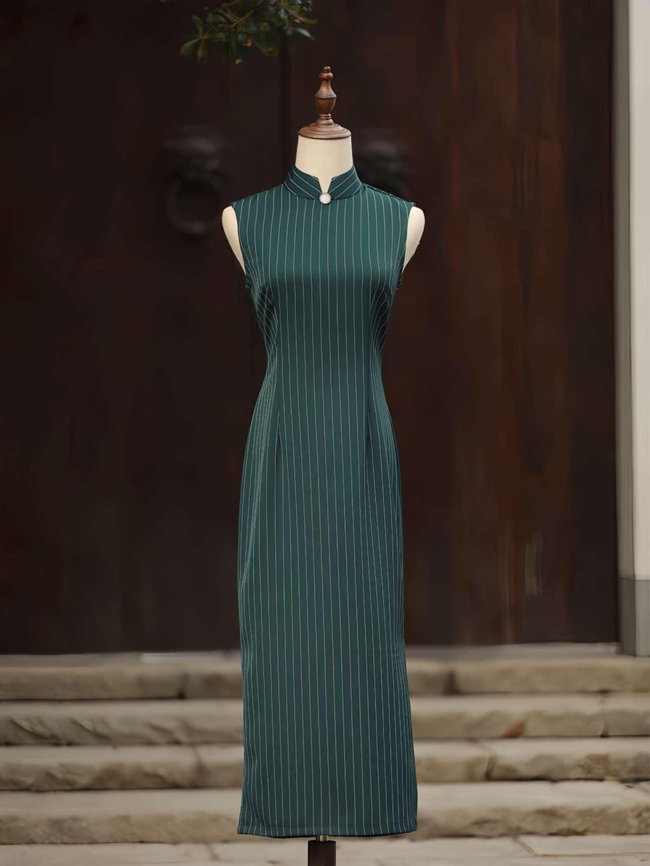 Dark Green Qipao Dress, Sleeveless Cheongsam, Retro Striped Chinese Dress, Elegant Office Qipao, Minimalist Oriental Dress