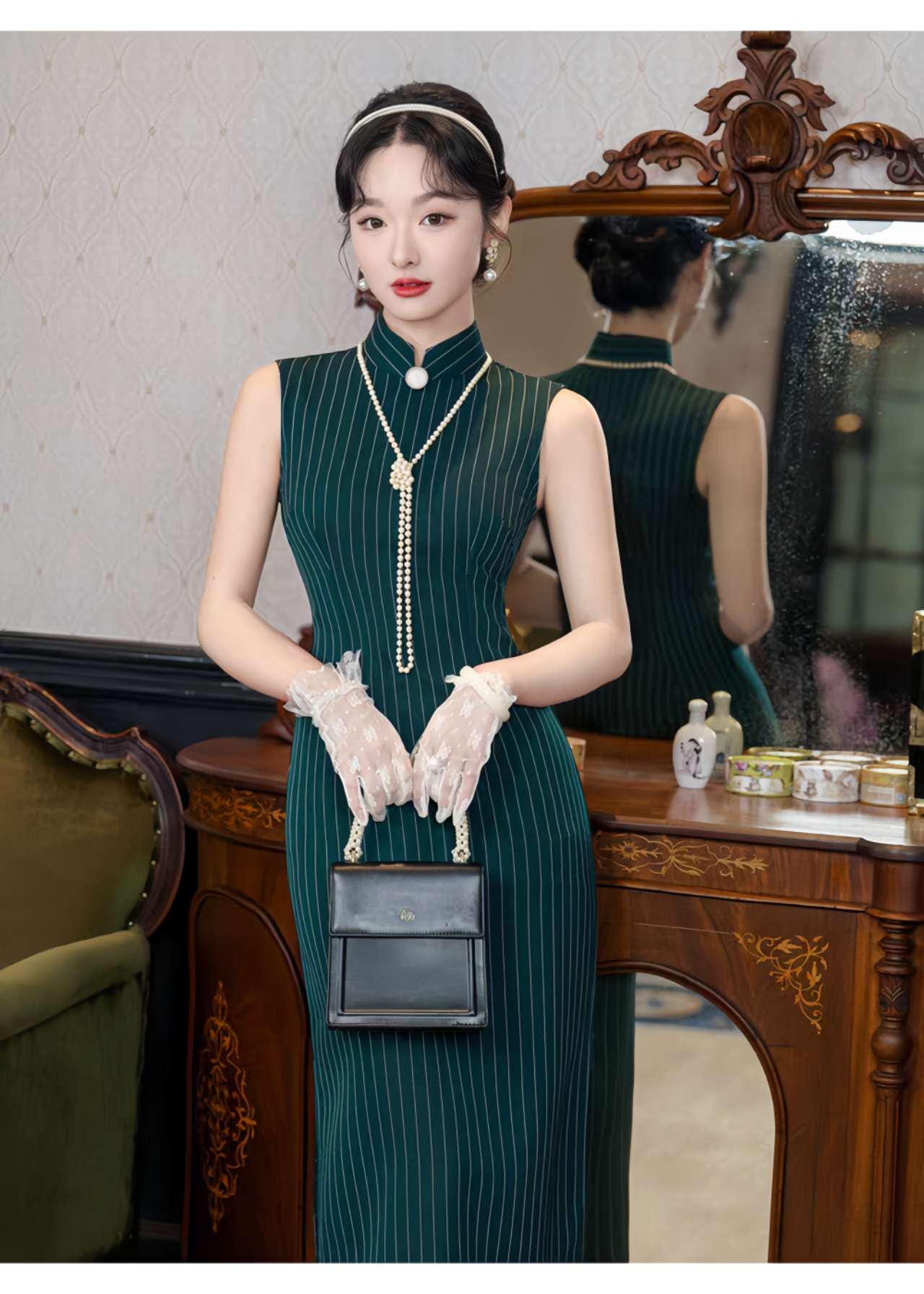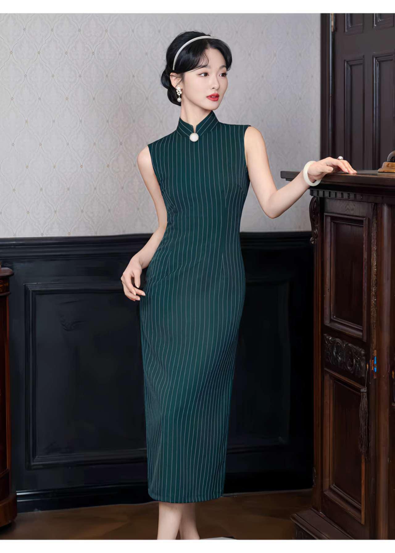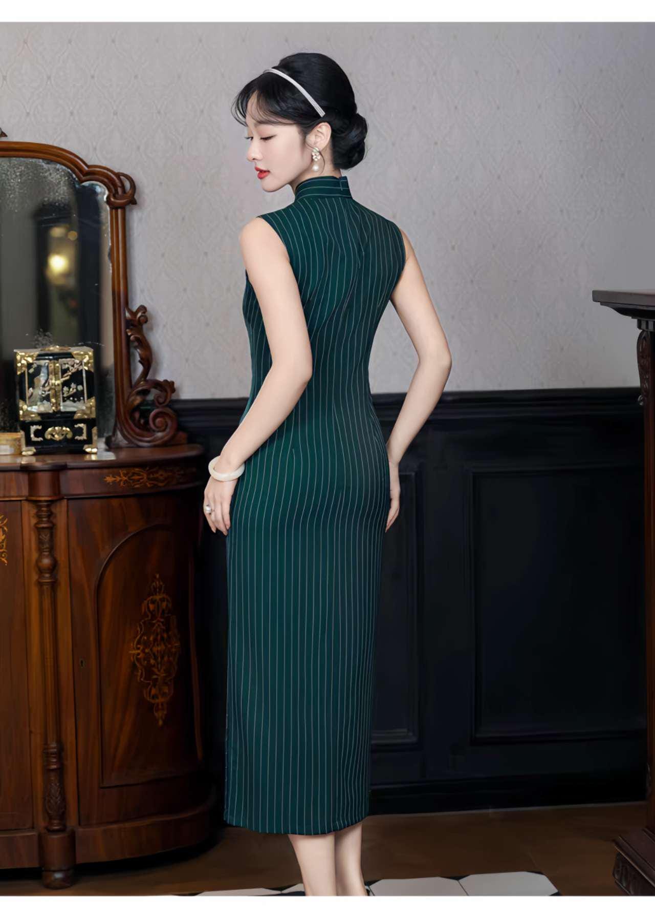 Dark Green Qipao Dress, Sleeveless Cheongsam, Retro Striped Chinese Dress, Elegant Office Qipao, Minimalist Oriental Dress