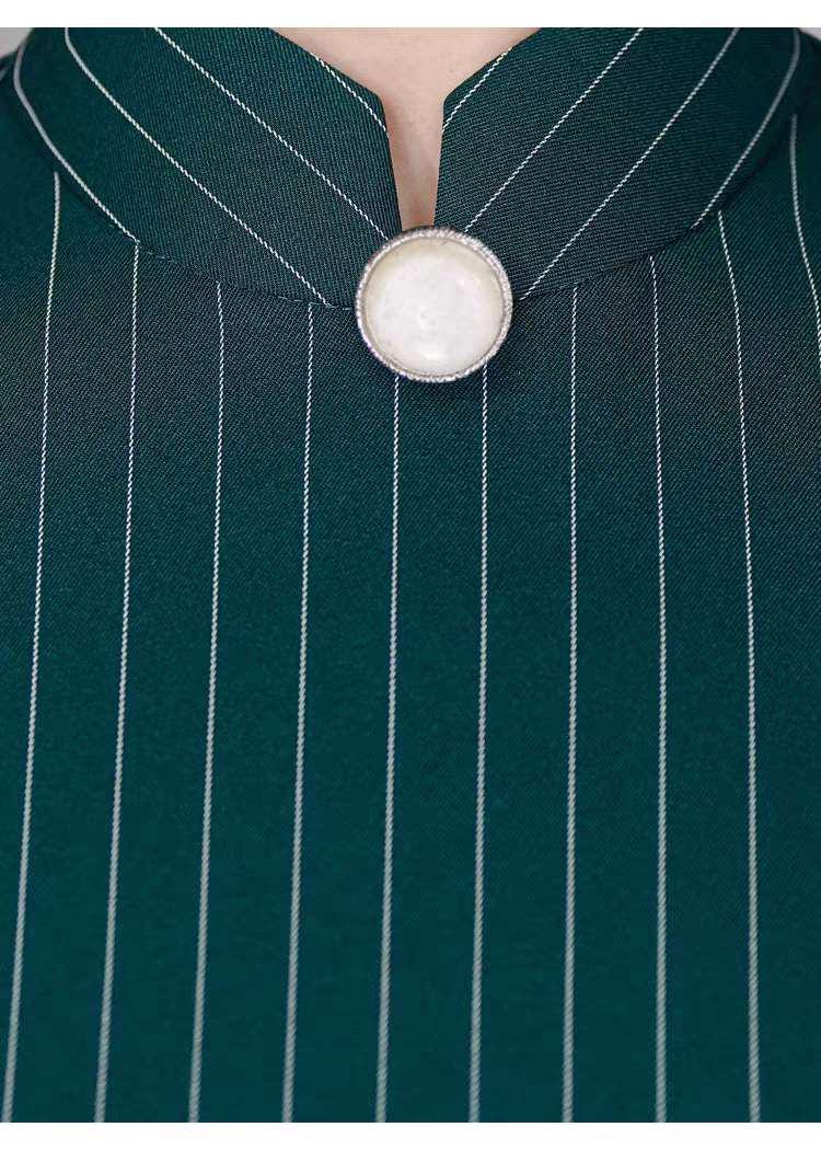 Discover understated elegance with this dark green striped qipao, crafted from soft and comfortable Shangsi silk. Its minimalist design features a sleeveless silhouette, a classic Mandarin collar, and a pearl button for a delicate touch.