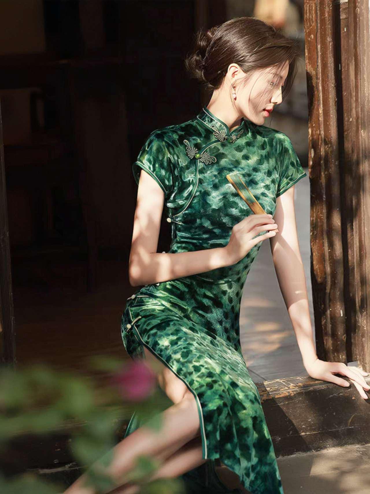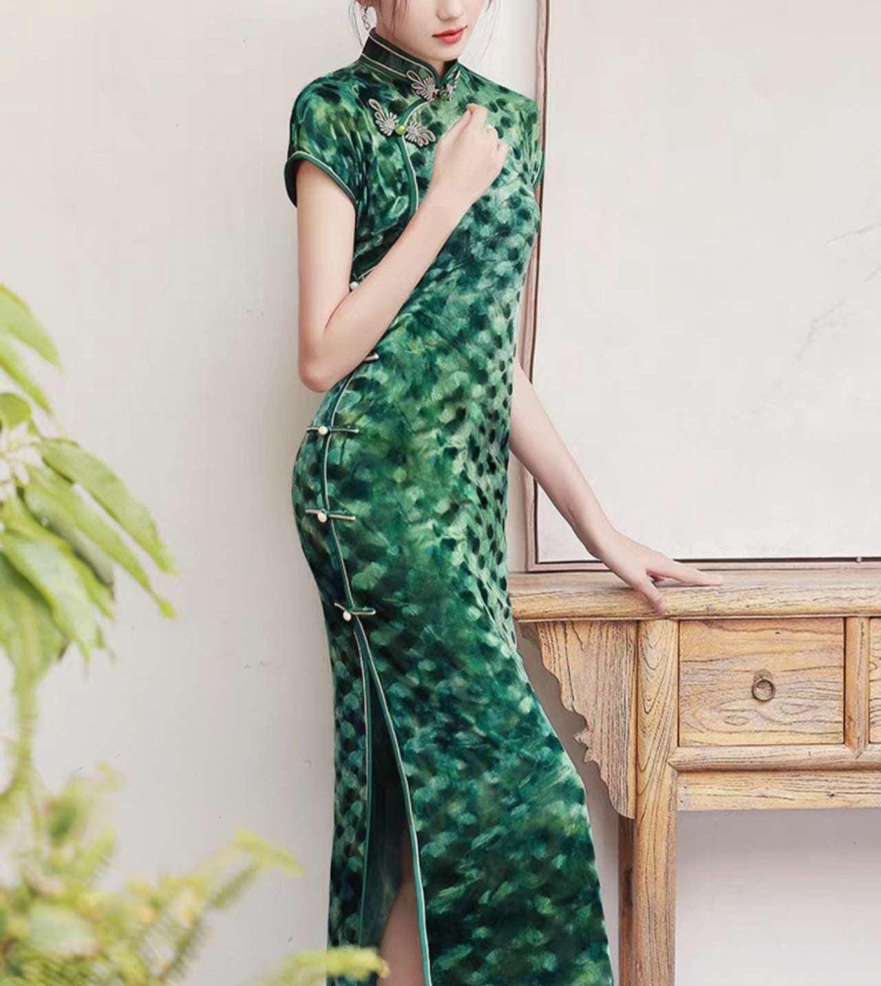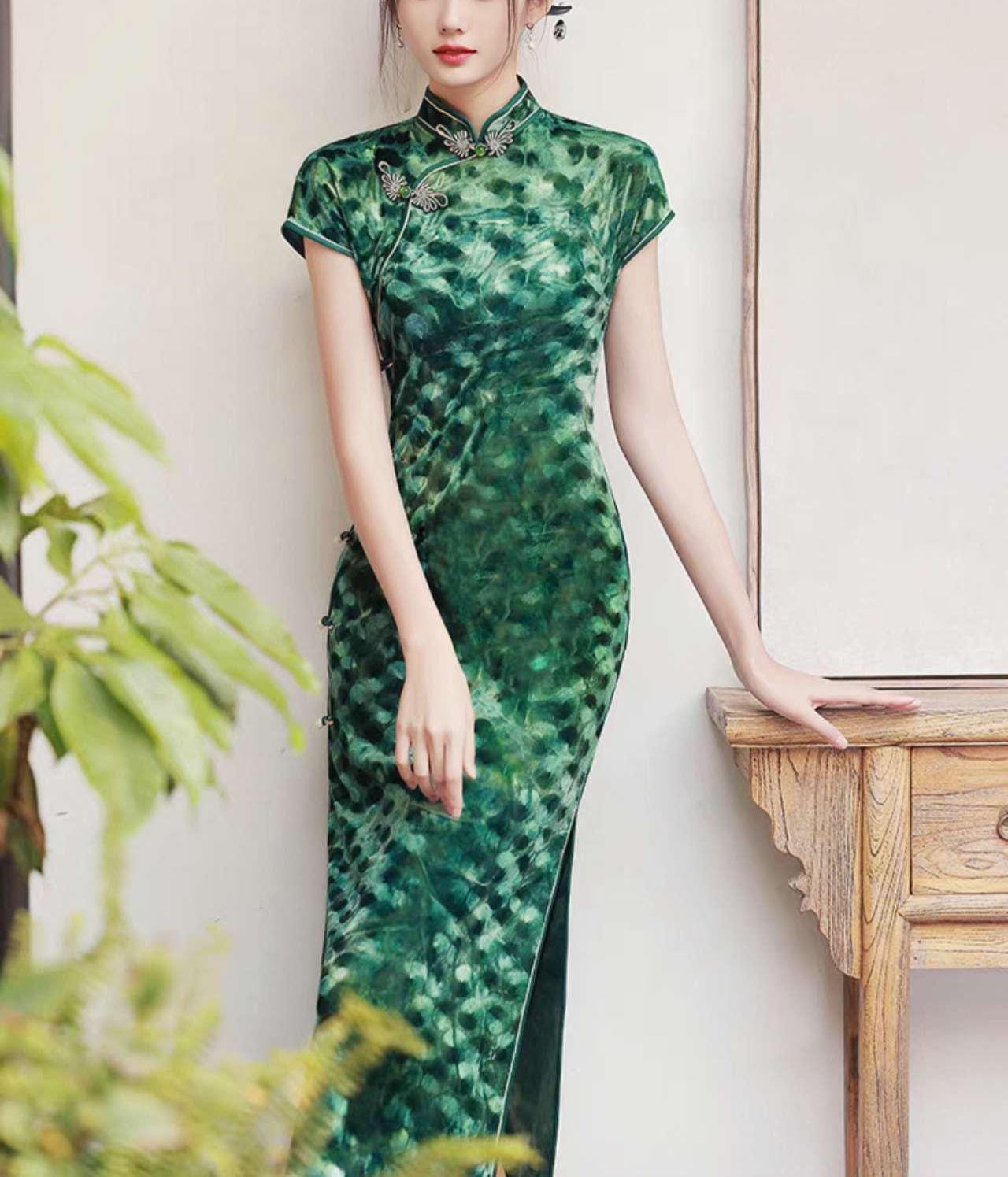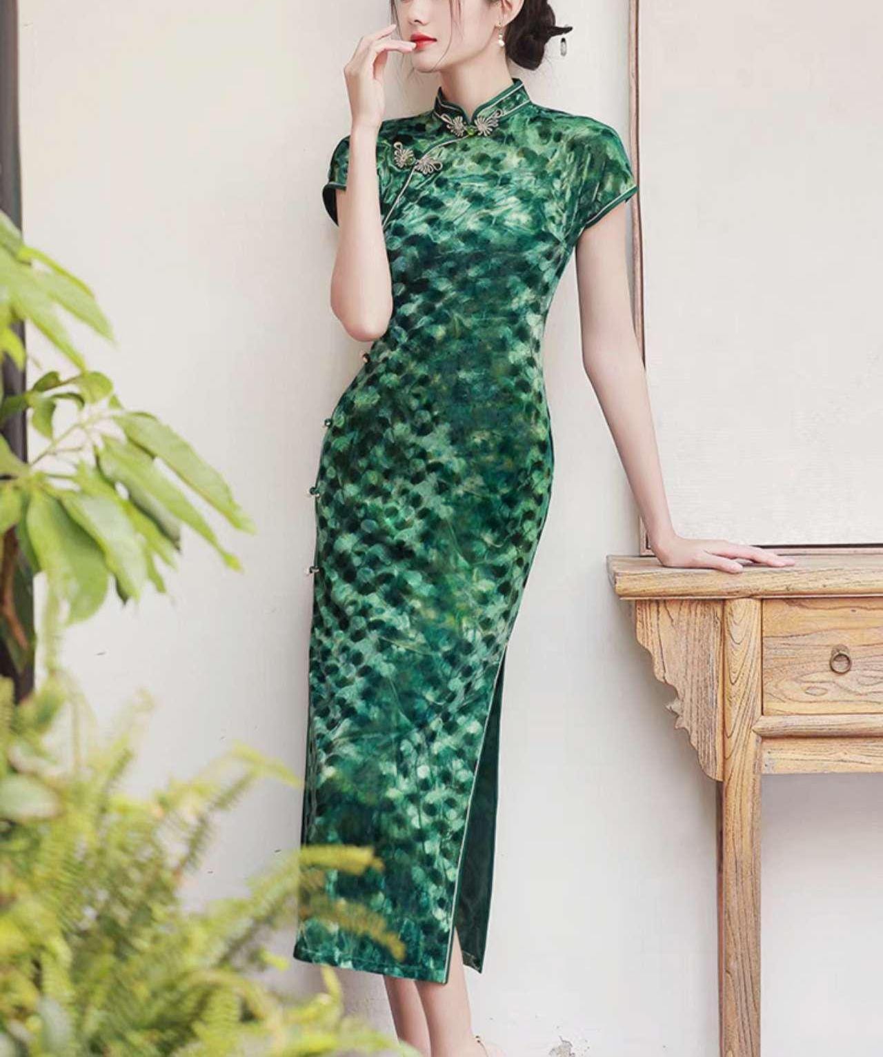 Embrace timeless beauty with this dark green velvet qipao, a refined blend of traditional Chinese elegance and vintage glamour. Crafted from high-quality velvet, this long cheongsam dress features a diagonal closure with Chinese knot buttons and a fitted cut that highlights the feminine silhouette. The deep emerald hue evokes the charm of old Shanghai, while the subtle print adds texture and depth.