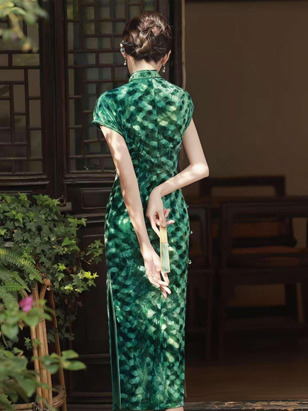Green Velvet Qipao Dress, Women's Retro Cheongsam, Shanghai Inspired Party Dress, Elegant Vintage Tea Dress