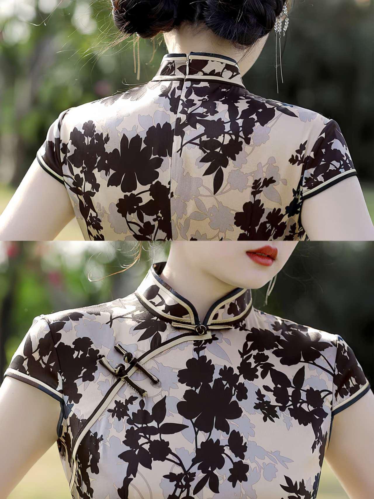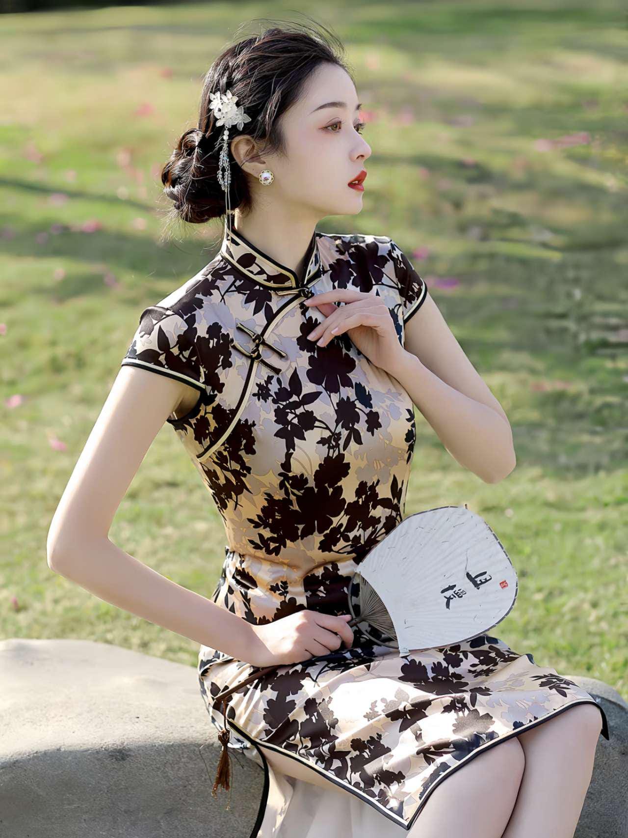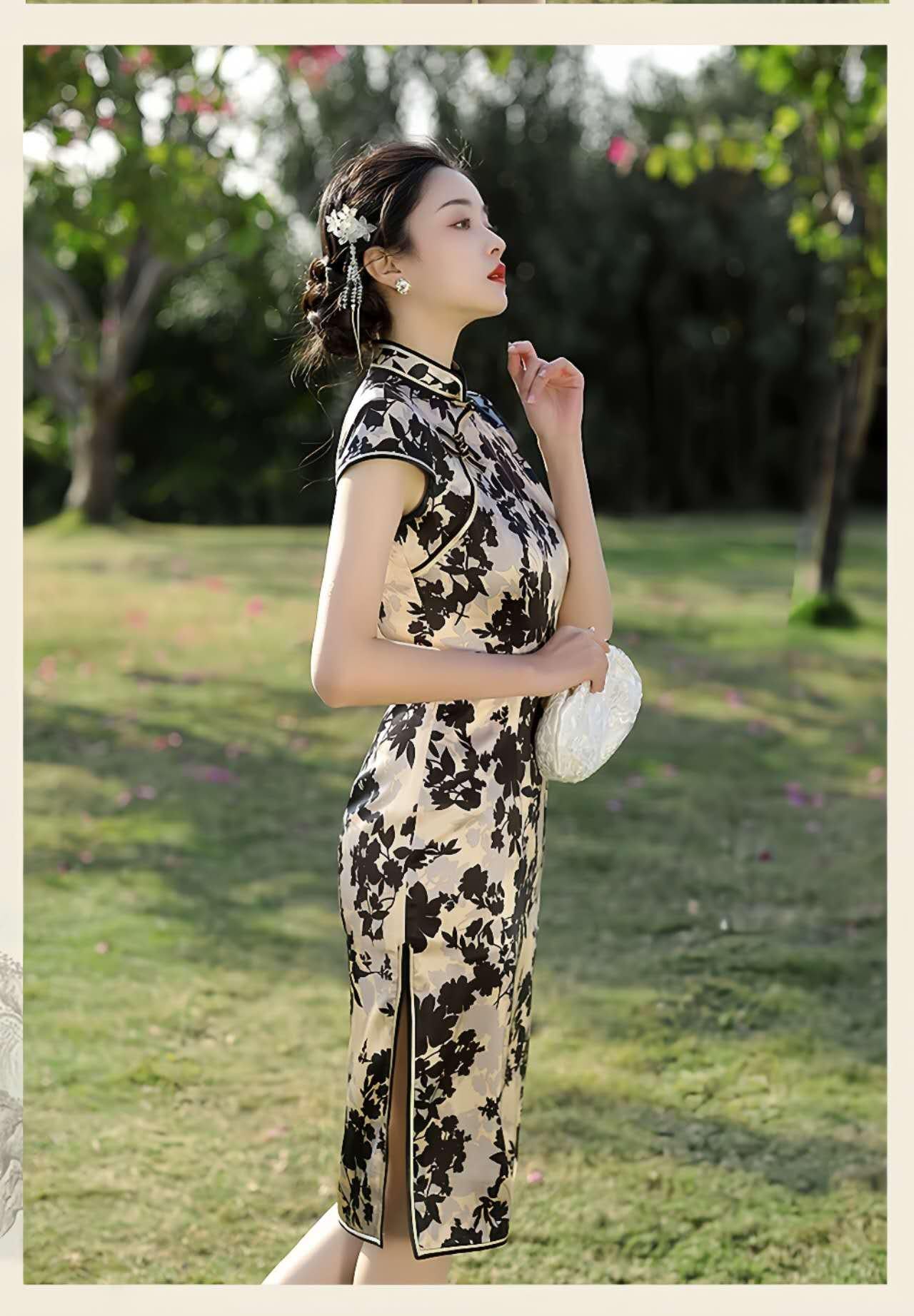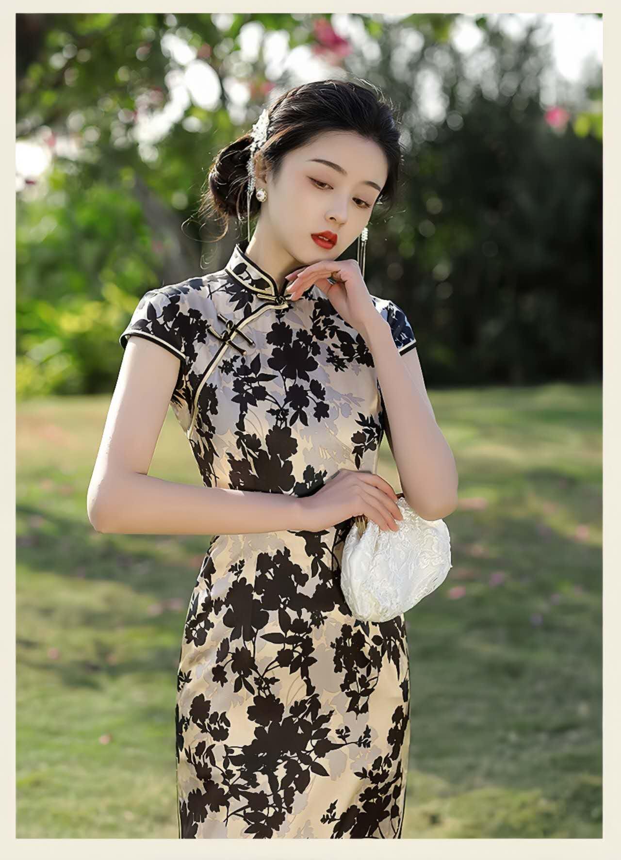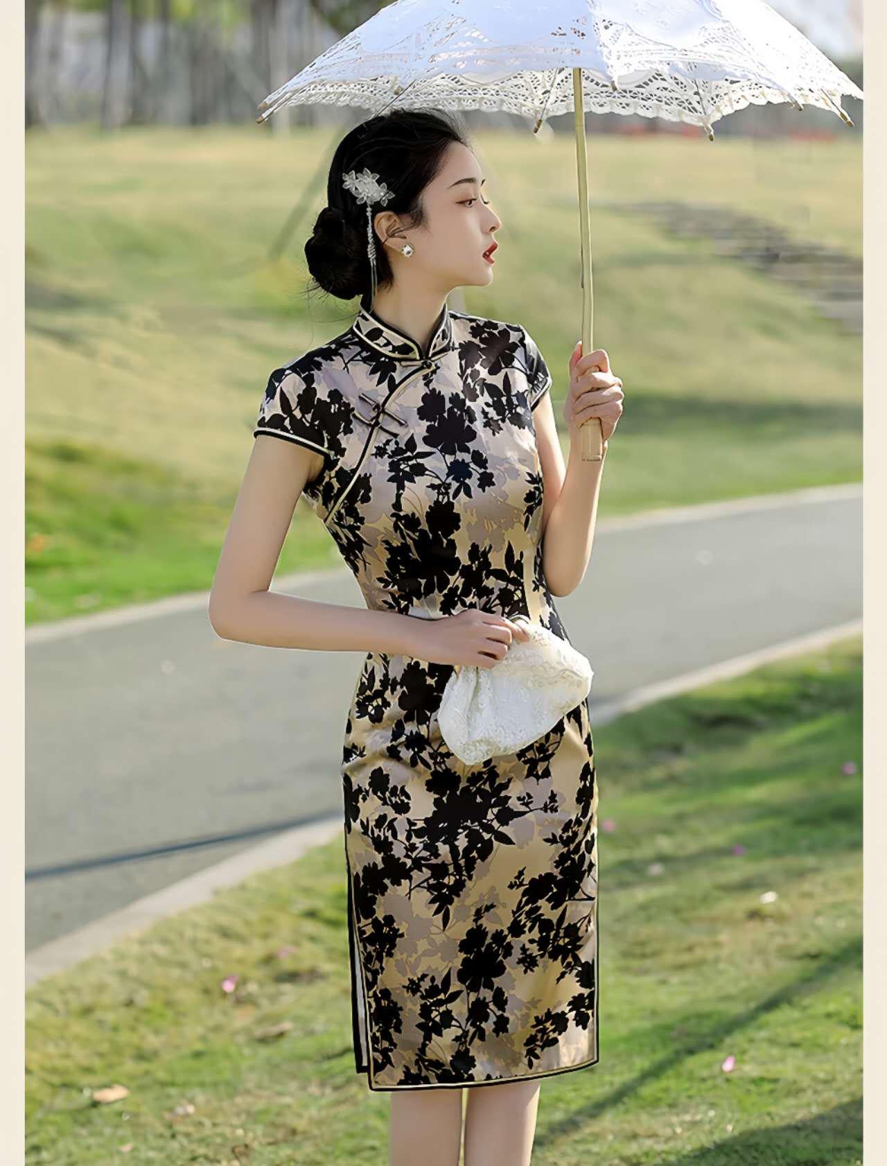 Show off your timeless elegance in this vintage-inspired qipao dress, carefully crafted from natural mulberry silk. This short-sleeved cheongsam features a high Mandarin collar, traditional Chinese knot button closure, and a fitted cut that flatters the feminine silhouette. The refined black floral print on a champagne gold background lends a luxurious feel, perfect for elegant parties, cultural events, or sophisticated evening gatherings.