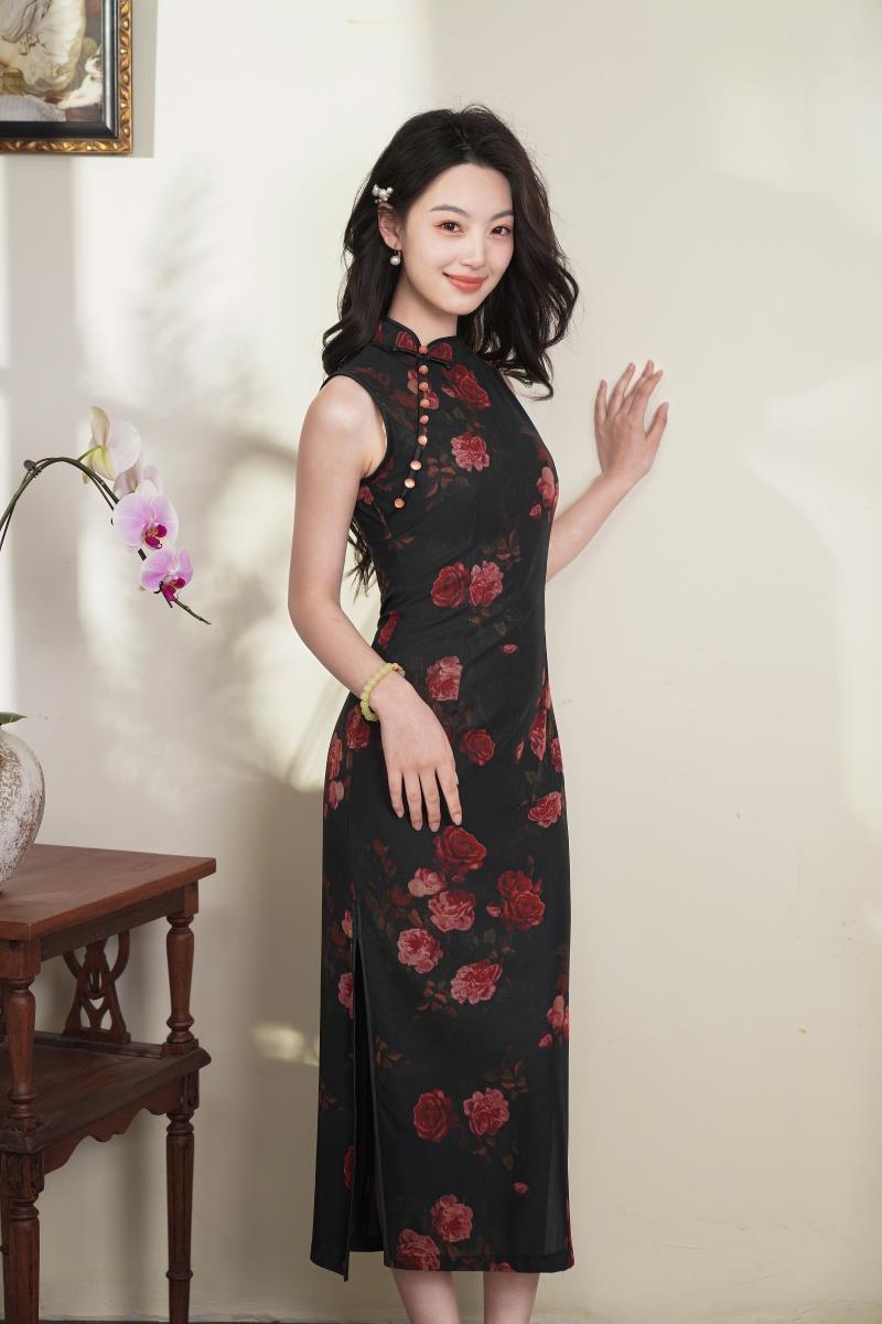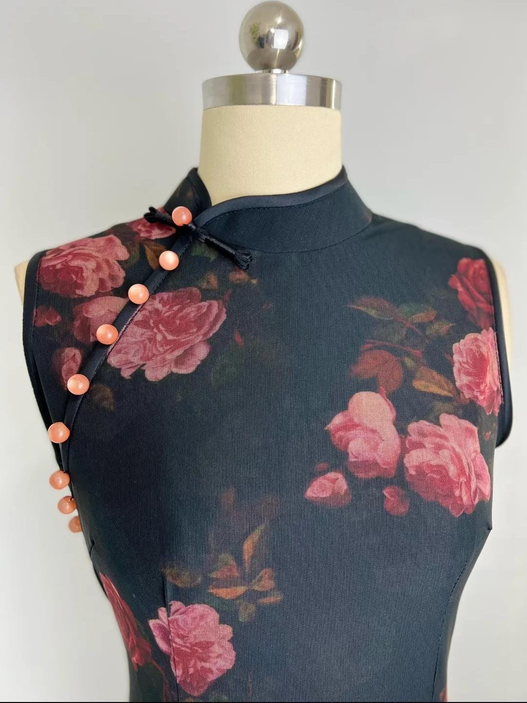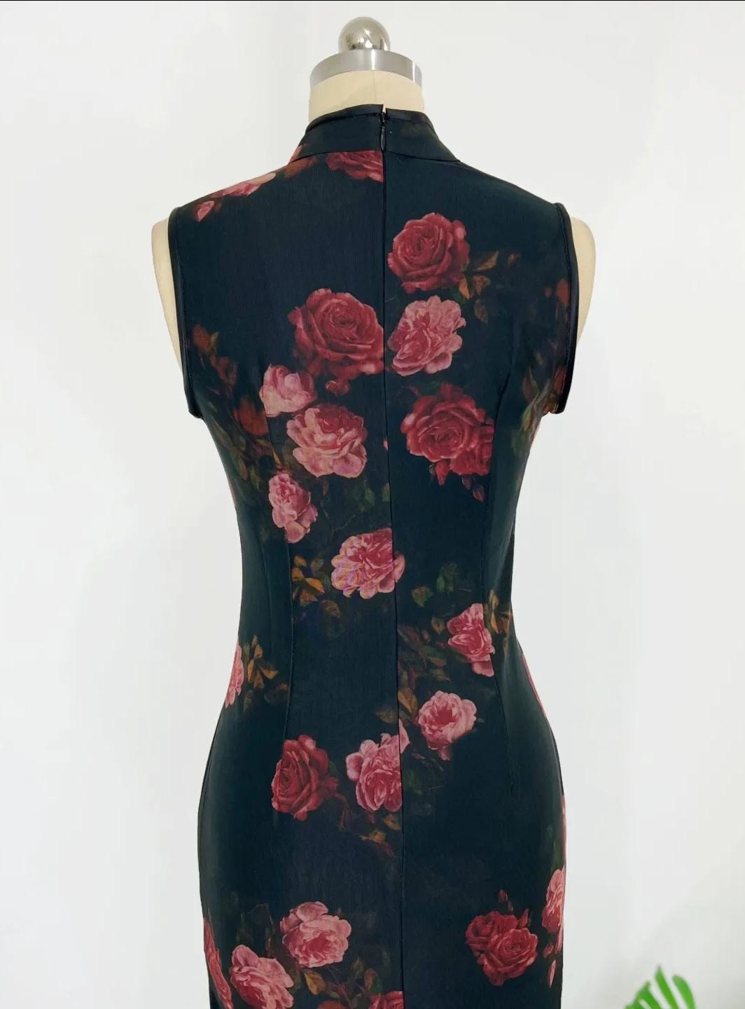 Look feminine and sophisticated in this rose-patterned qipao, crafted from soft, breathable Swiss mesh, perfect for summer. Its traditional asymmetrical neckline and slim fit create a refined and romantic oriental silhouette.