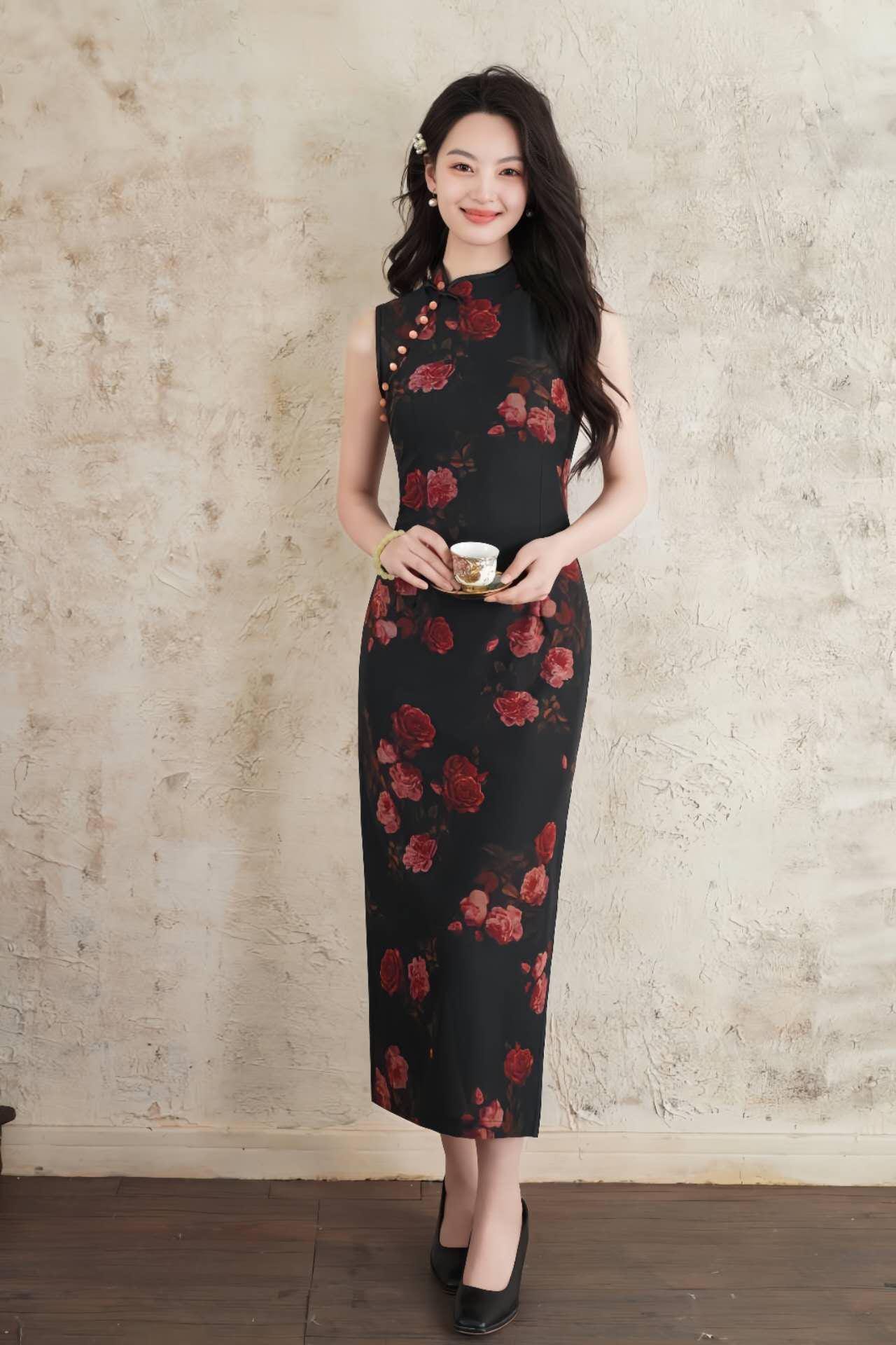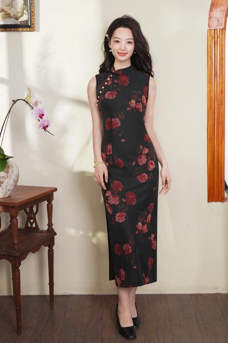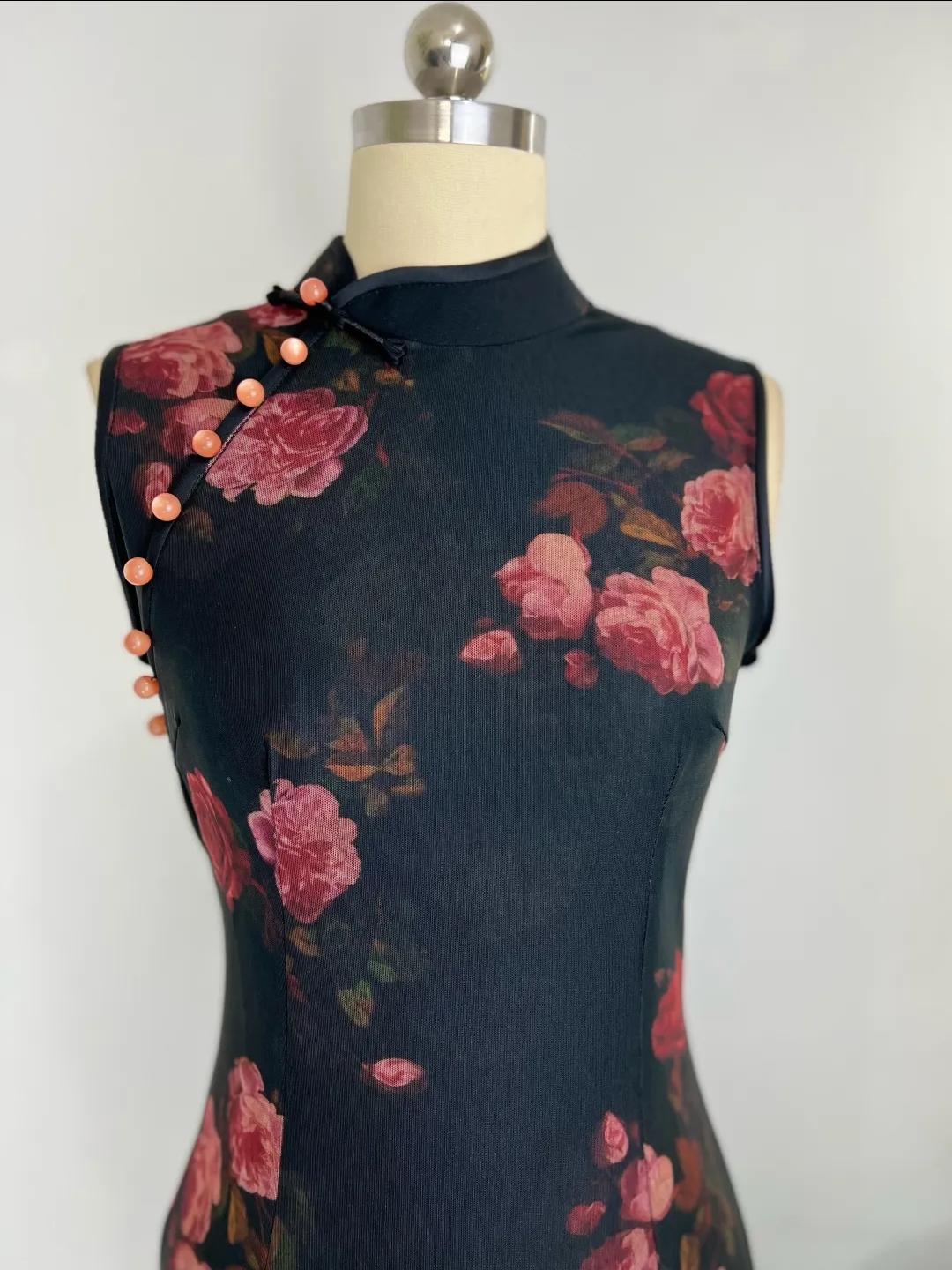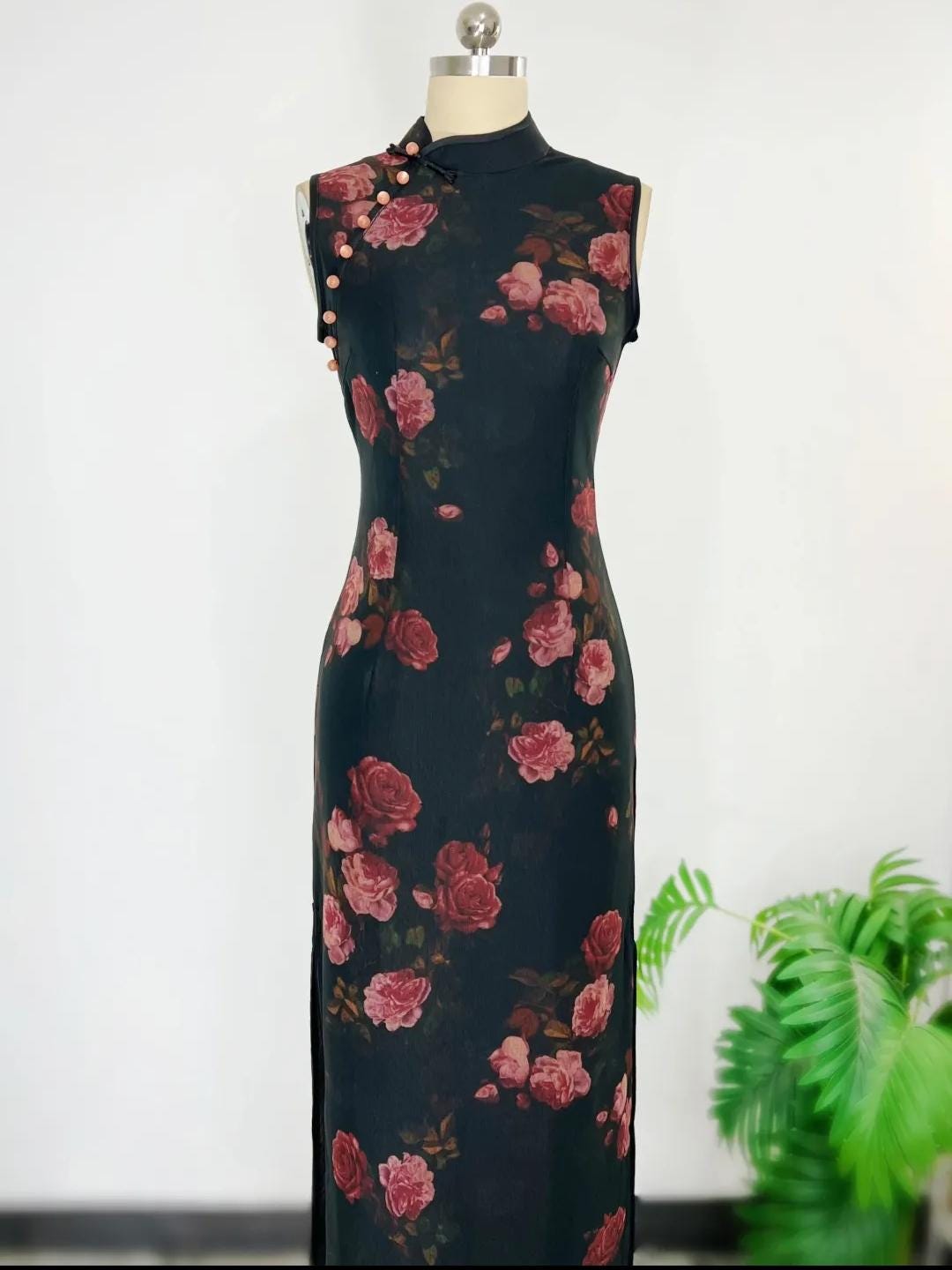 Look feminine and sophisticated in this rose-patterned qipao, crafted from soft, breathable Swiss mesh, perfect for summer. Its traditional asymmetrical neckline and slim fit create a refined and romantic oriental silhouette.