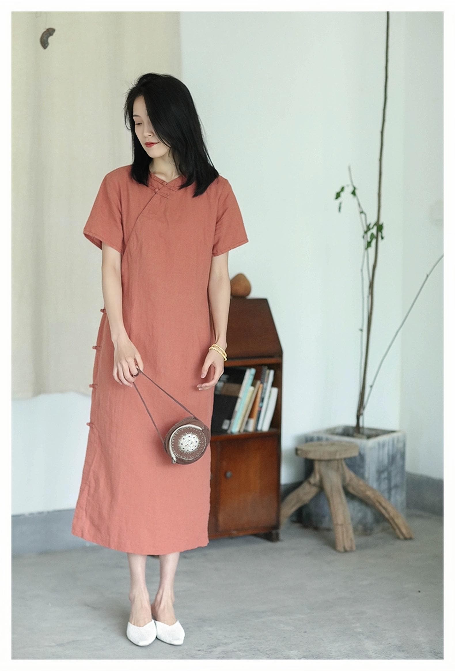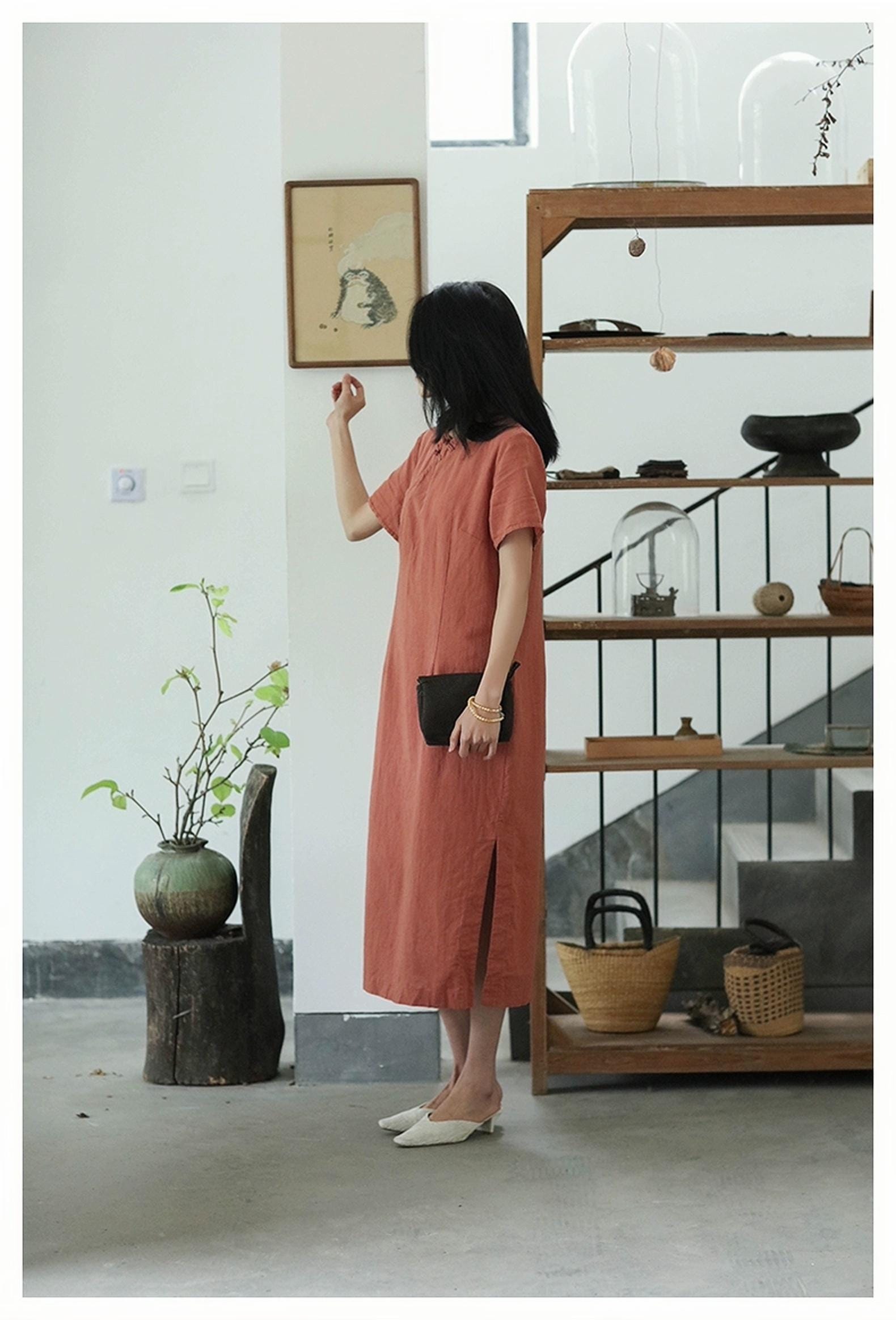 Made from soft and breathable natural cotton, the dress has a mid-length of 112 cm, falling gracefully below the knee. Perfect for summer retreats, tea ceremonies, art studios, or mindful living.
