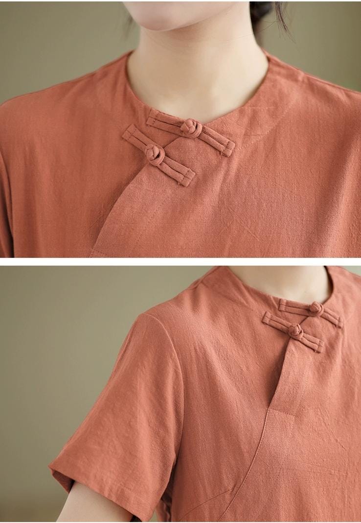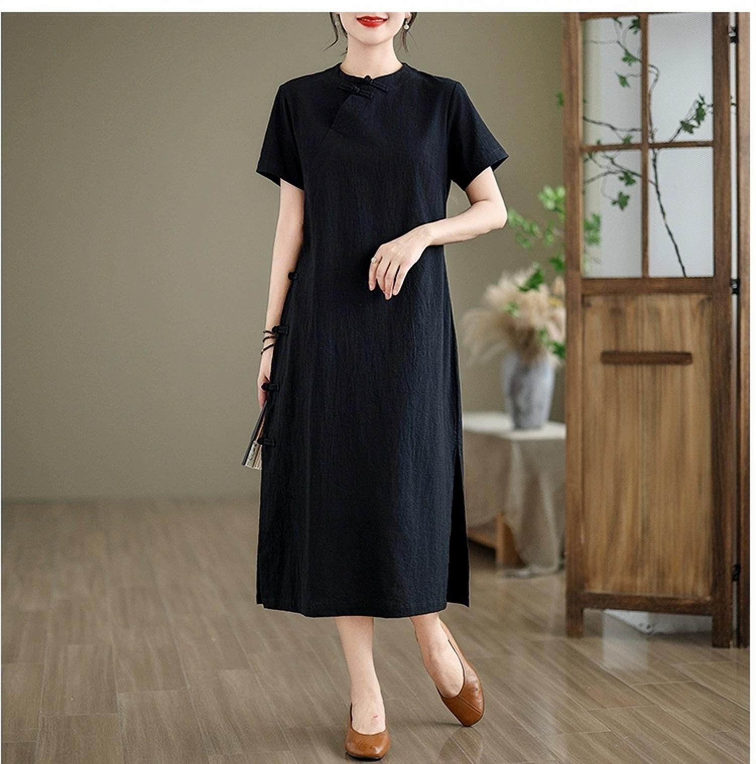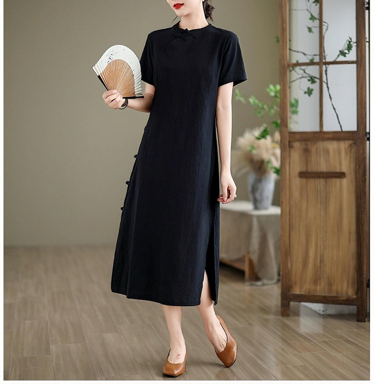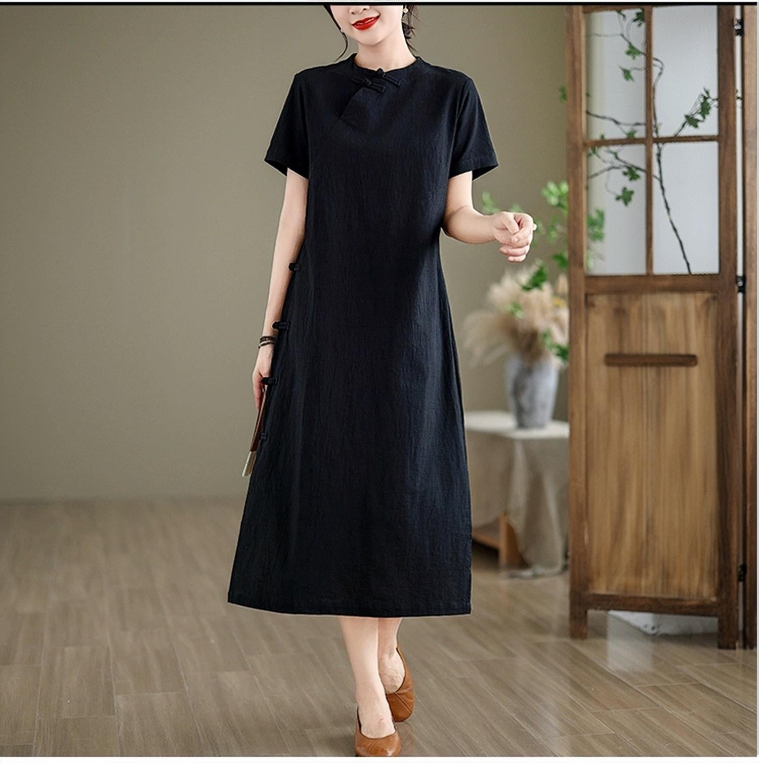 Discover quiet elegance with this Zen-inspired black cotton dress, a refined expression of wabi-sabi minimalism and Asian tradition. The understated Mandarin collar, diagonal Chinese buttons, and A-line silhouette reflect timeless beauty and serene simplicity.